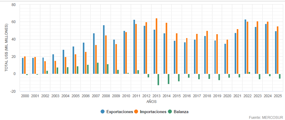 Desde el año 1999 donde se comenzó con este proceso del acuerdo hasta el presente, en el siguiente gráfico observamos que inicialmente desde el 2000 hasta el 2012 la balanza comercial fue positiva hacia el MERCOSUR pero desde el 2013 hasta el 2025 fue negativa; por ello fundamentamos que más allá de su dimensión estrictamente comercial adquiere significación estratégica en términos de la crisis al multilateralismo y los aranceles fijados por la administración Trump.