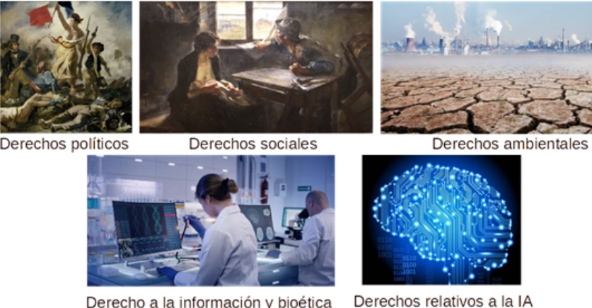 Según la clasificación del Council of Europe [3], los derechos de tercera generación, surgidos en la segunda mitad del siglo XX, son aquellos relativos a los derechos colectivos y buscan proteger el derechos de acceso a los bienes comunes de la ciudadanía tal como el derecho de acceso al desarrollo generado a partir de los grandes avances en las ingenierías química, electrónica y de los materiales de esos años así como el derecho al ambiente sano surgido como derecho complementario al anterior debido a los elevados indices de contaminación que tal desarrollo estaba generando. Los derechos de cuarta generación, surgidos ya a comienzos del siglo XXI, son aquellos relativos a los derechos vinculados a la globalización y la bioética surgidos como consecuencia de la aparición de internet y las técnicas de manipulación genética. Entre ellos, se pueden mencionar el derecho de acceso a la información, a la protección de datos personales, a la privacidad digital, a la dignidad humana y a la identidad genética, entre otros. Más recientemente se puede pensar también en los derechos de quinta generación que son los que protegen las libertades individuales y colectivas frente a la inteligencia artificial, las tecnologías vanguardistas como la nanotecnología y la biotecnología de avanzada, y consagran los derechos de acceso a los bienes comunes de la humanidad como el agua, la preservación del planeta, la biodiversidad e incluso desarrolla el concepto de ética global en el uso de innovaciones disruptivas y la protección de los derechos de las generaciones futuras.